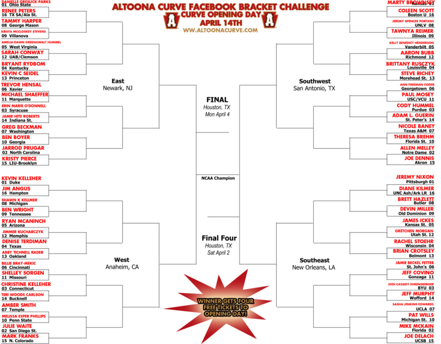 The person paired up with the winning team will receive four free tickets to the Altoona Curve Opening Day game on April 14th at 6:30 p.m. and an invitation to join us for our “Champions of Curve, PA” celebration (click here for information). Also, don’t worry if you’ve drawn Northern Colorado or Hampton because the Curve will be running more fun contests and maybe you’ll have better luck next time! Thanks for playing and here’s the bracket: (Click the link to the left or click on the bracket itself to enlarge the picture)