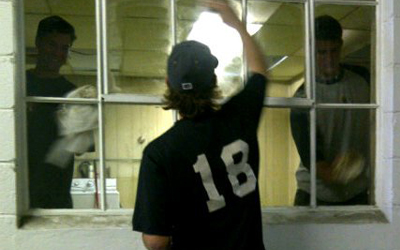 Aaron Thompson (center), Brad Chalk (left) and Aaron Pribanic (right) begin to clean the windows