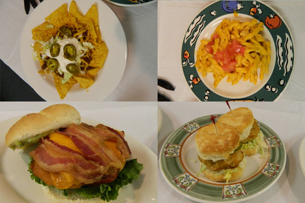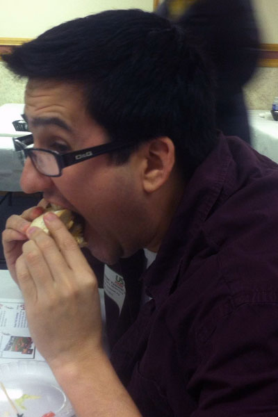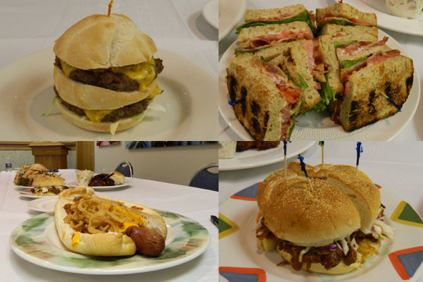 The next set of items were a bit heavier than the first four and we started off with a double-decker style hamburger that tasted quite good on the toasted Kaiser roll. Again though, as you can see I had a tough time trying to take a bite because of its massiveness! After the bugger we went to a three tiered club sandwich that was placed on wheat berry bread. From there we traversed the waters to another big item in a hand pulled slow roasted bbq chicken on a Kaiser roll topped with cole slaw and pepper jack cheese! Up next was another item served on a biscuit but this time it was some ham topped with cheese. We also sampled some BBQ chicken that could be served by itself or as part of a meal but then it was on to the big dog (literally). This dog was a half pounder topped with cheese sauce, chili and onion straws on a 10″ roll.