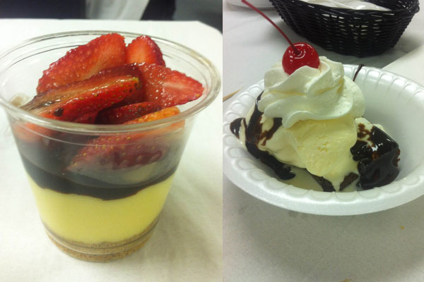 After all that, we still had the dessert style courses. I know..you’re thinking how can we eat all this stuff, right? Well the desserts we sampled were NY inspired cheesecake served in a parfait cup and a sundae-type dessert. The cheesecake was a graham cracker (bottom layer), cheesecake, chocolate and then strawberries to top it off. The other was a typical sundae style with Vanilla ice cream topping brownie pieces with hot fudge, whipped cream and a cherry.