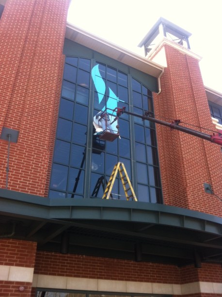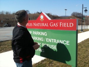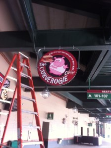 If you’ve checked us out on Twitter this week you might have seen some photos of some of the new signage going up at the ballpark. In fact, we’ve got some going up today as they are constructing the giant blue flame for the main window above the VIP entrance as I pen (well type) this masterpiece of a blog. Maybe by the time I’m finished writing they’ll have finished putting up the flame, which will also be front-lit for all to see during the wee hours of the night! As you can see here on the left, C.O.O. David Lozinak helps change out some of the parking lot signage here at the ballpark to display the new Peoples Natural Gas Field name. The other piece of signage that was put up this week was also the sign for one of our new food items here at the ballpark: the Curverogie!