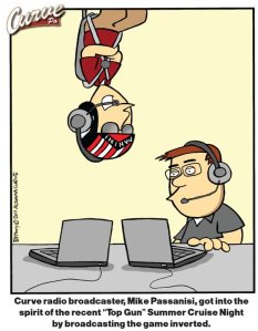 In other news, the Curve comics have started up once again in the Altoona Mirror and you can catch them every Wednesday and Sunday leading up to their daily run, which begins on Sunday April 1st. We are just as excited as you all to see what comic genius Bill Bettwy has in store for us this year! I’d have to say my favorite that I’ve ever appeared in over my two seasons here was this one when I went a little overboard for Top Gun night last year as part of the Nittany Travel Summer Cruise Series, which is back again this season. Maybe this year he’ll draw me as Cole Trickle?